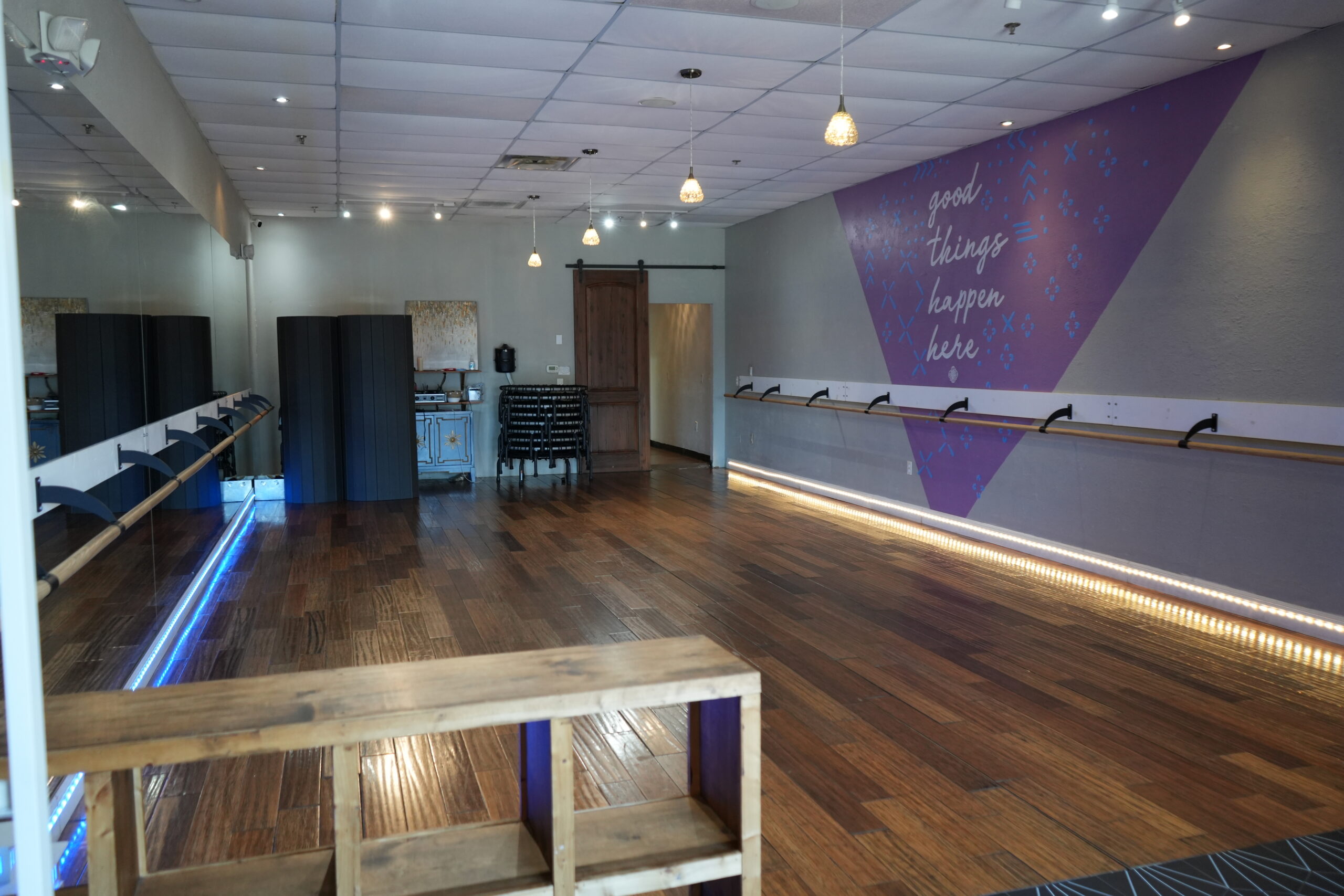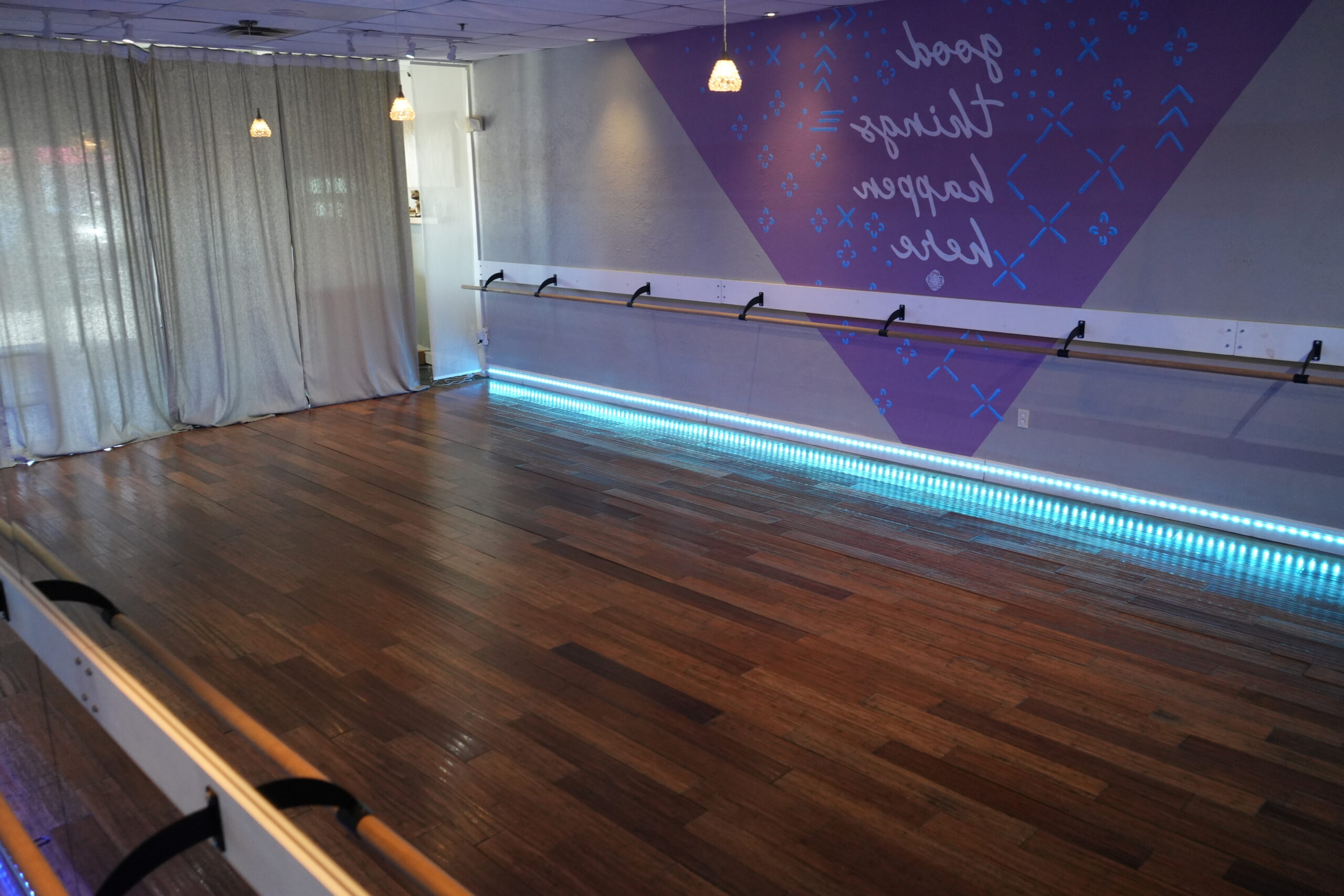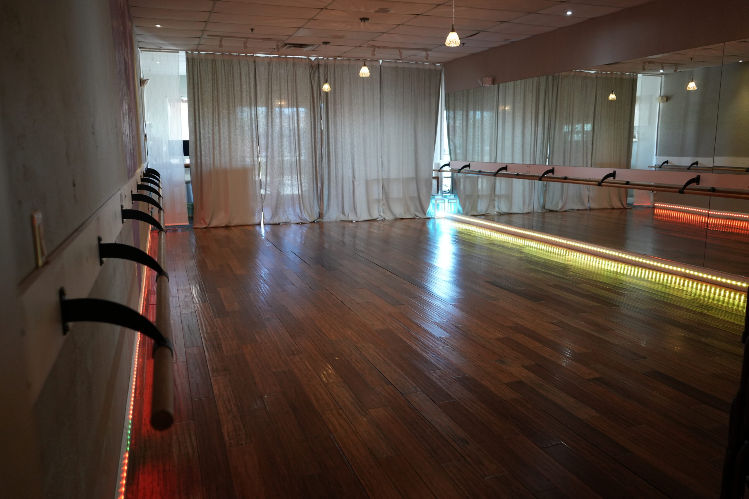 Our main dance room features a professionally installed Marley dance floor by Stagestep, designed for optimal performance, safety, and versatility. This floor provides exceptional shock absorption and slip resistance, ensuring a secure and comfortable surface for all styles of dance. Both of our large studio spaces are also equipped with wall-mounted barres for barre work and technique training.